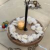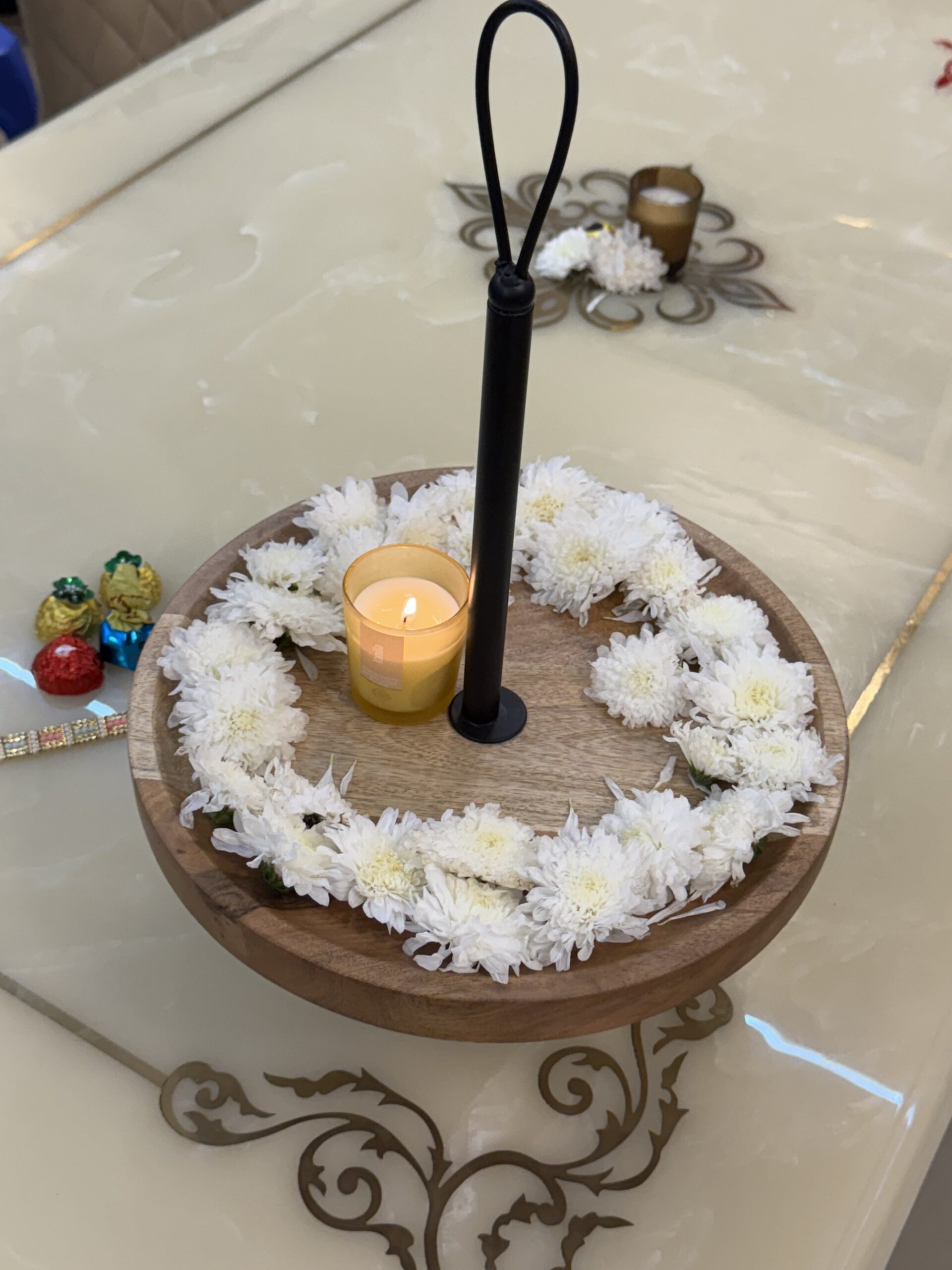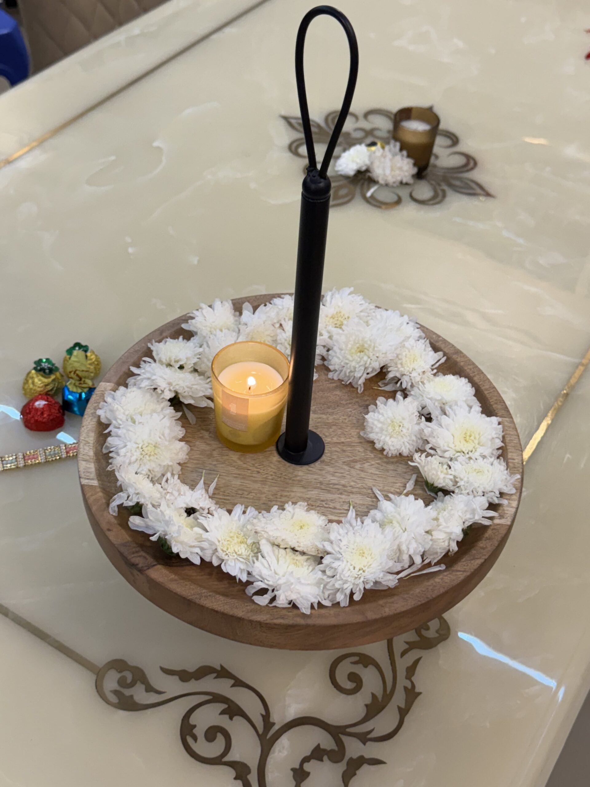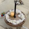 Elegant round wooden platter with a sturdy iron handle, beautifully styled with fresh flowers and a glowing candle—perfect for festive home décor. This versatile piece can be used as a centerpiece, a decorative tray for celebrations, or even as a functional serving platter for snacks and drinks during gatherings. A blend of tradition and modern design, it adds charm to any festive setup.