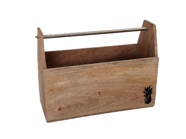 Rustic Wooden Storage Caddy with Metal Handle – Pineapple Motif