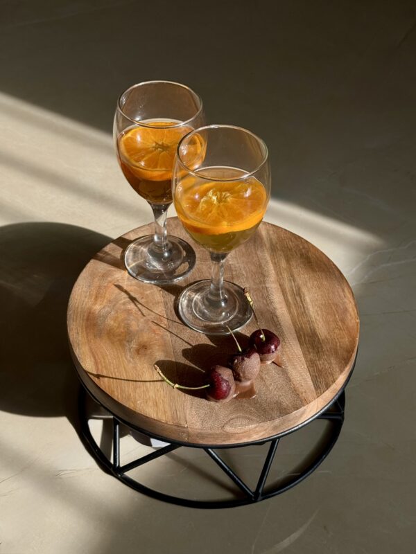 This combination of a wooden tray and a metal designer stand creates a functional and eye-catching centerpiece, perfect for modern homes, cafes, or dining settings that blend rustic and industrial styles. The tray is made of wood, showcasing a natural grain and warm tones that add a rustic yet sophisticated appeal It elevates the tray above the surface, making it ideal for serving or displaying items stylishly at parties or gatherings and this festive season